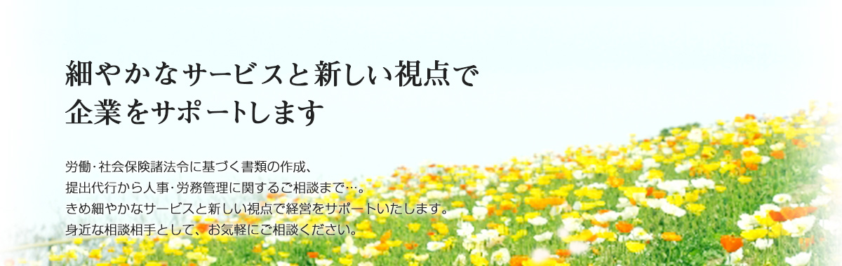 社会保険・労働保険諸法令に基づく事務手続きの代行・相談 労働・社会保険への加入、各種給付金の請求、帳簿書類の作成などの事務手続きを